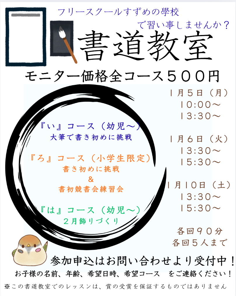 フリースクールすずめの學校で書道教室を開催します。