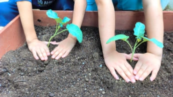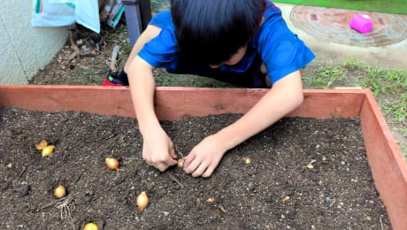 敷地内のとっても小さな庭で野菜を選び、植え、育てます。